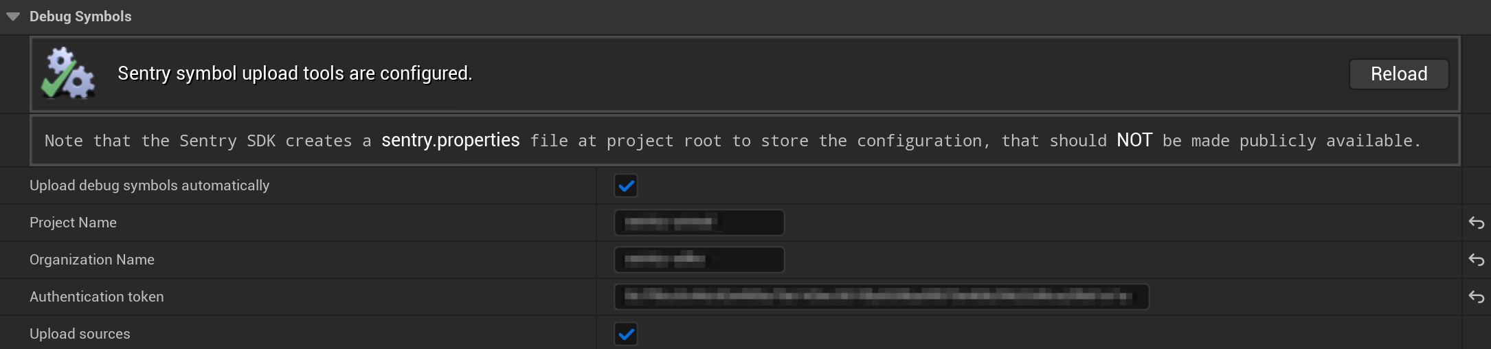 The automated debug symbols upload is disabled by default and requires configuration. To configure it, navigate to Project Settings > Plugins > Sentry, then enter the Auth Token, Organization Slug, and Project Name. Note, that the Unreal Engine SDK automatically creates a sentry.properties